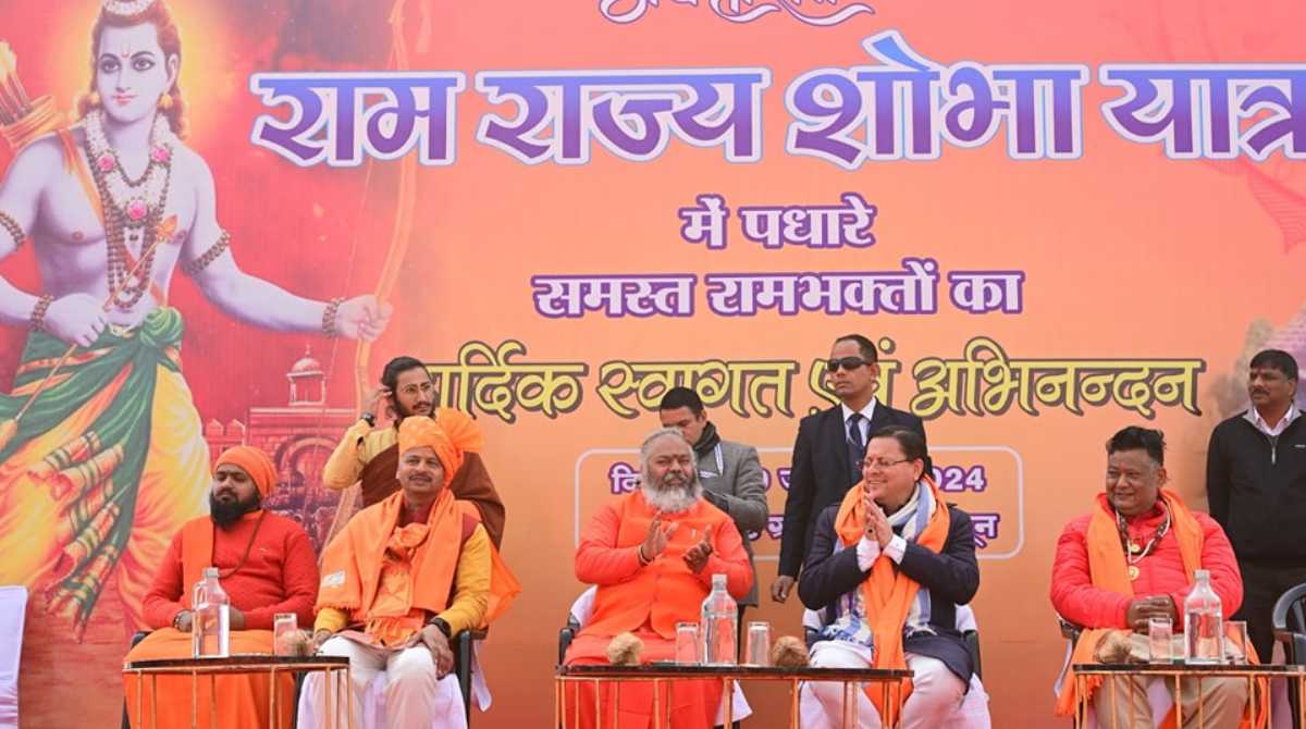 मिली जानकारी के अनुसार मुख्यमंत्री पुष्कर सिंह धामी ने आज परेड ग्राउंड, देहरादून में श्री राम मंदिर प्राण प्रतिष्ठा उत्सव समिति द्वारा आयोजित “राम राज्य शोभायात्रा” कार्यक्रम में प्रतिभाग किया। परेड ग्राउंड से शुरू हुई शोभा यात्रा घंटाघर होते हुए पलटन बाजार तक निकाली गई। शोभा यात्रा का शुभारंभ मुख्यमंत्री पुष्कर सिंहोधामी ने किया। वहीं बताया जा रहा है कि हजारों की संख्या में शामिल शोभा यात्रा में आम लोगों के साथ ही भाजपा के नेता और कार्यकर्ता भी मौजूद थे। तो वहीं शोभा यात्रा के दौरान तमाम बच्चे प्रभु हनुमान रूपी वस्त्रों में नजर आए।
